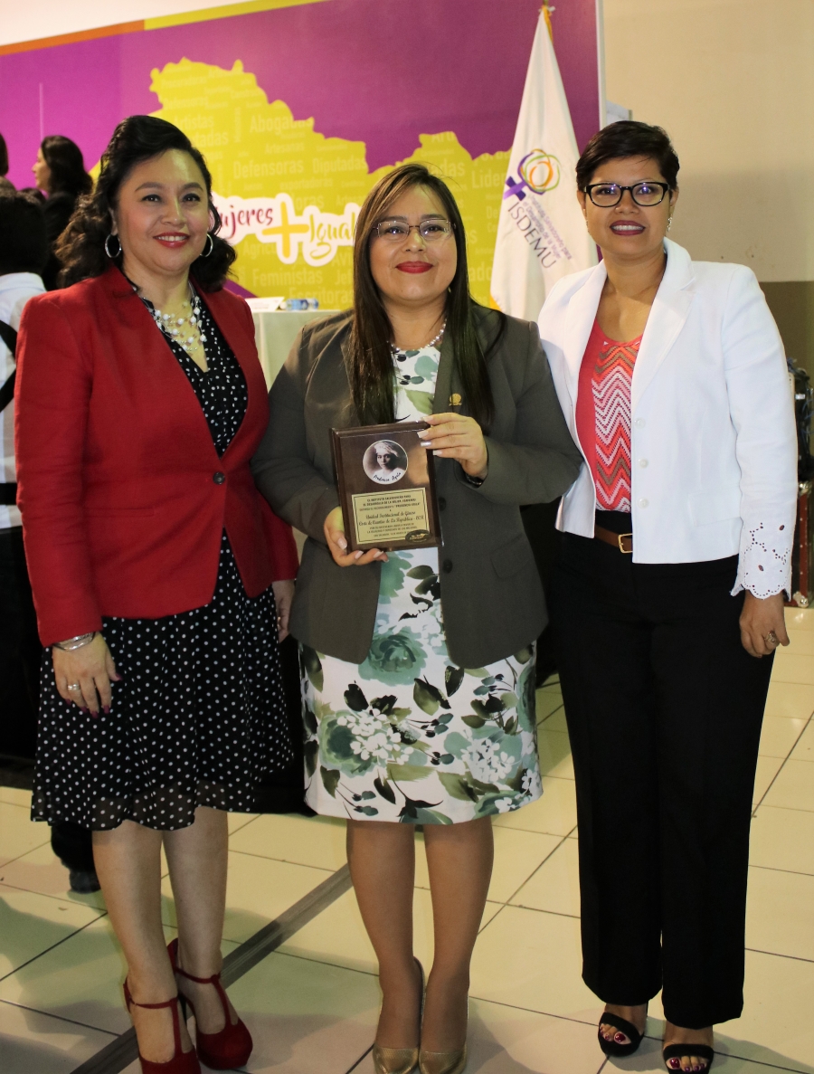 La Primera Magistrada de la Corte de Cuentas de la República, Licda. María del Carmen Martínez Barahona, la Coordinadora General Administrativa, Licda. Patricia Dagmar Menjívar de Palacios, y la Encargada de la Unidad de Género Institucional (UGI), Licda. Patricia Ivonne Dominguez de Barahona, recibieron en representación de esta Entidad Fiscalizadora, el reconocimiento "Prudencia Ayala", otorgado por el Instituto Salvadoreño para el Desarrollo de la Mujer (ISDEMU) a la UGI por su destacada labor a favor de la igualdad y derechos de las mujeres.