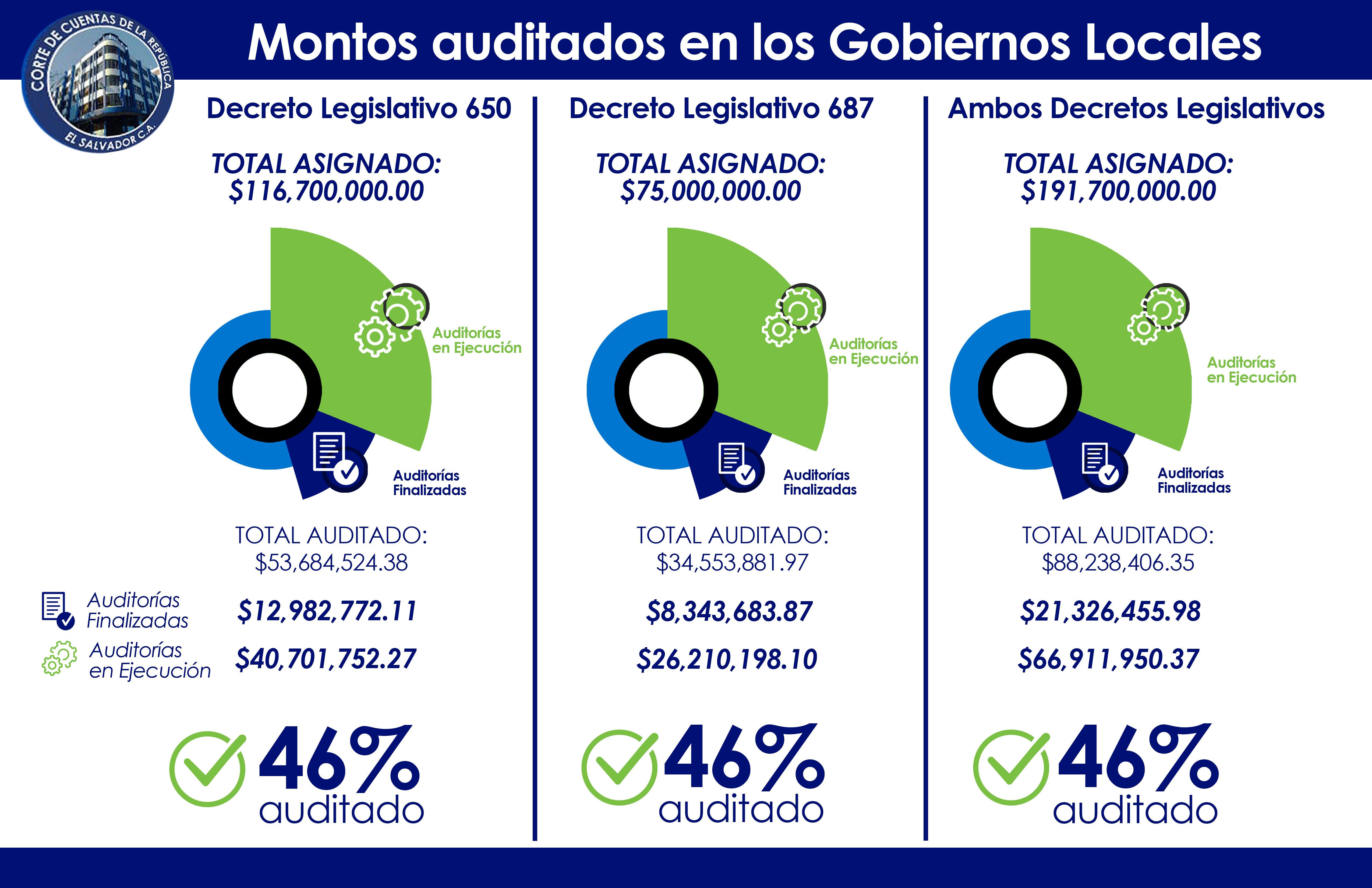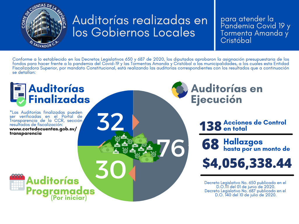Los fondos asignados en el Ejercicio Fiscal 2020 a las municipalidades por medio de los Decretos Legislativos 650 y 687 para hacer frente a la Pandemia por COVID-19 y a las Tormentas Amanda y Cristóbal, y que ascienden a un monto de $191 millones (191,700,000.00) dólares, están siendo auditados en el Plan de Auditoría 2021, a través de 138 acciones de control, de las cuales 32 se encuentran finalizadas, teniendo como resultado 68 hallazgos que han generado un cuestionamiento patrimonial que asciende a $4,056,338.44 dólares, mismo que se encuentran en la fase de Juicio de Cuentas.