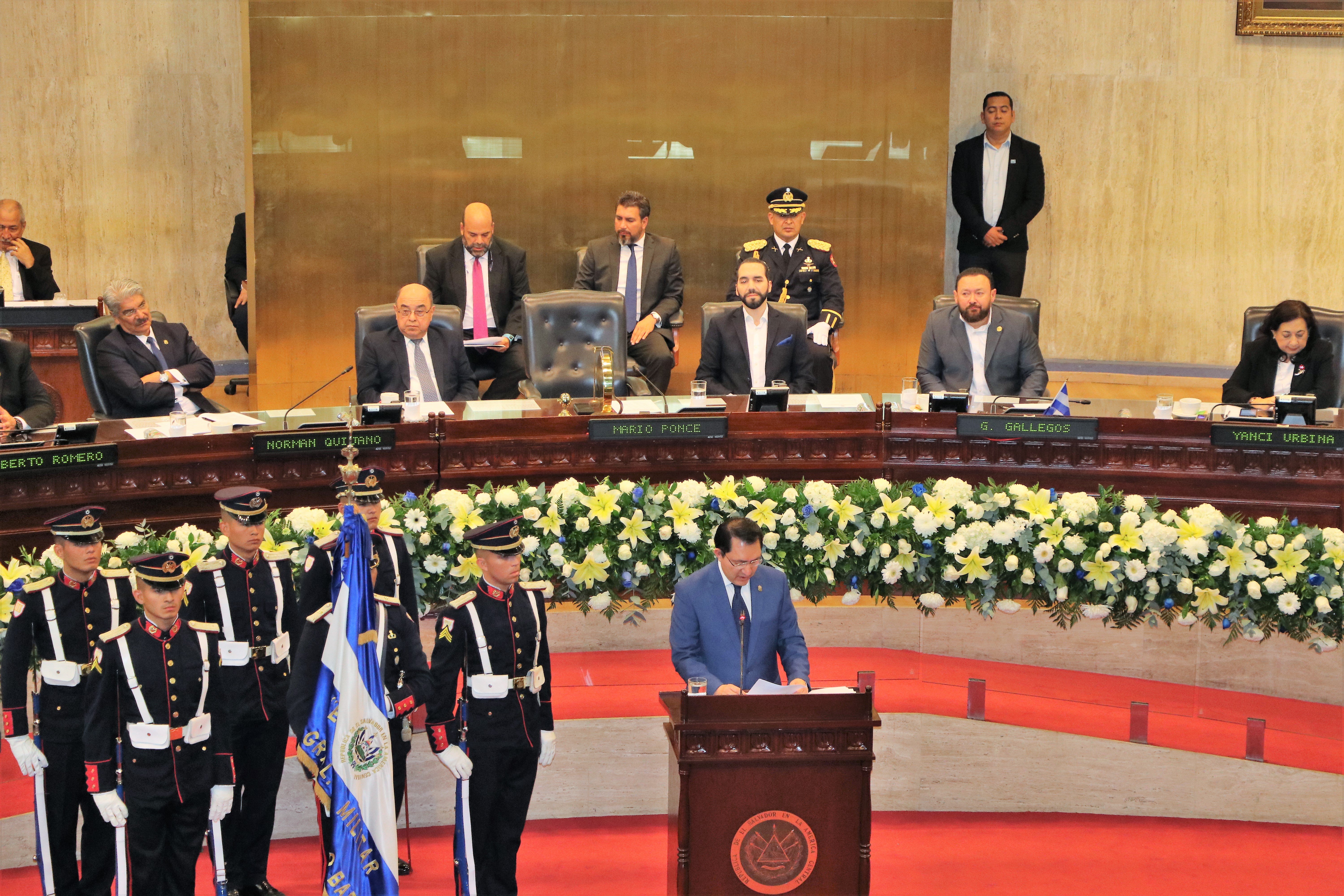 La Sesión Solemne contó además con la presencia del presidente de la Repíblica, Nayib Bukele y del presidente de la Corte Suprema de Justicia, Óscar Armando Pineda Navas, quienes tras su ingreso al Palacio Legislativo, acompañaron en la mesa de honor a la Junta Directiva de la Asaamblea y a su nuevo presidente.