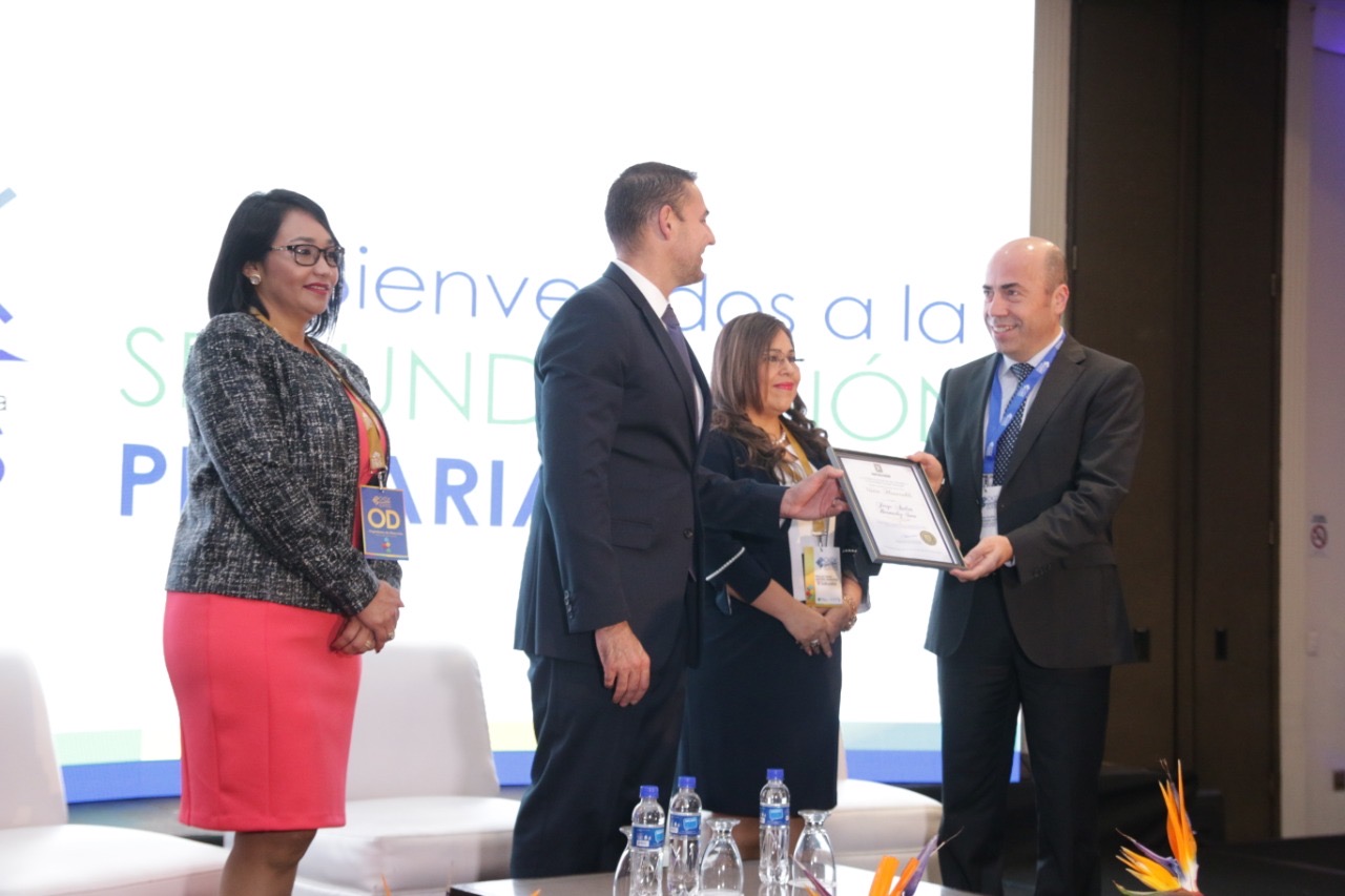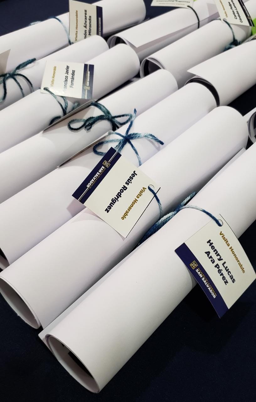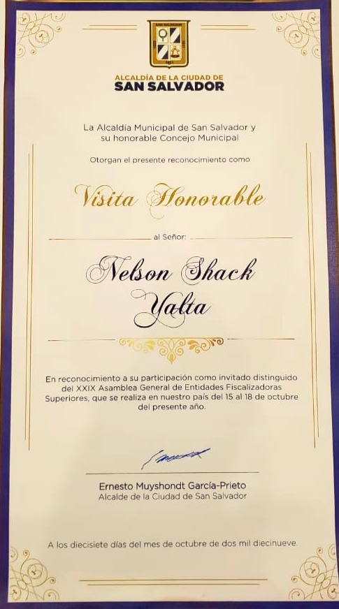 El alcalde de San Salvador Ernesto Muyshondt entregó este 17 de octubre pergaminos que acreditan como Visitantes Honorables a los participantes en la XXIX Asamblea General Ordinaria de la Organización Latinoamericana y del Caribe de Entidades Fiscalizadoras Superiores (OLACEFS).