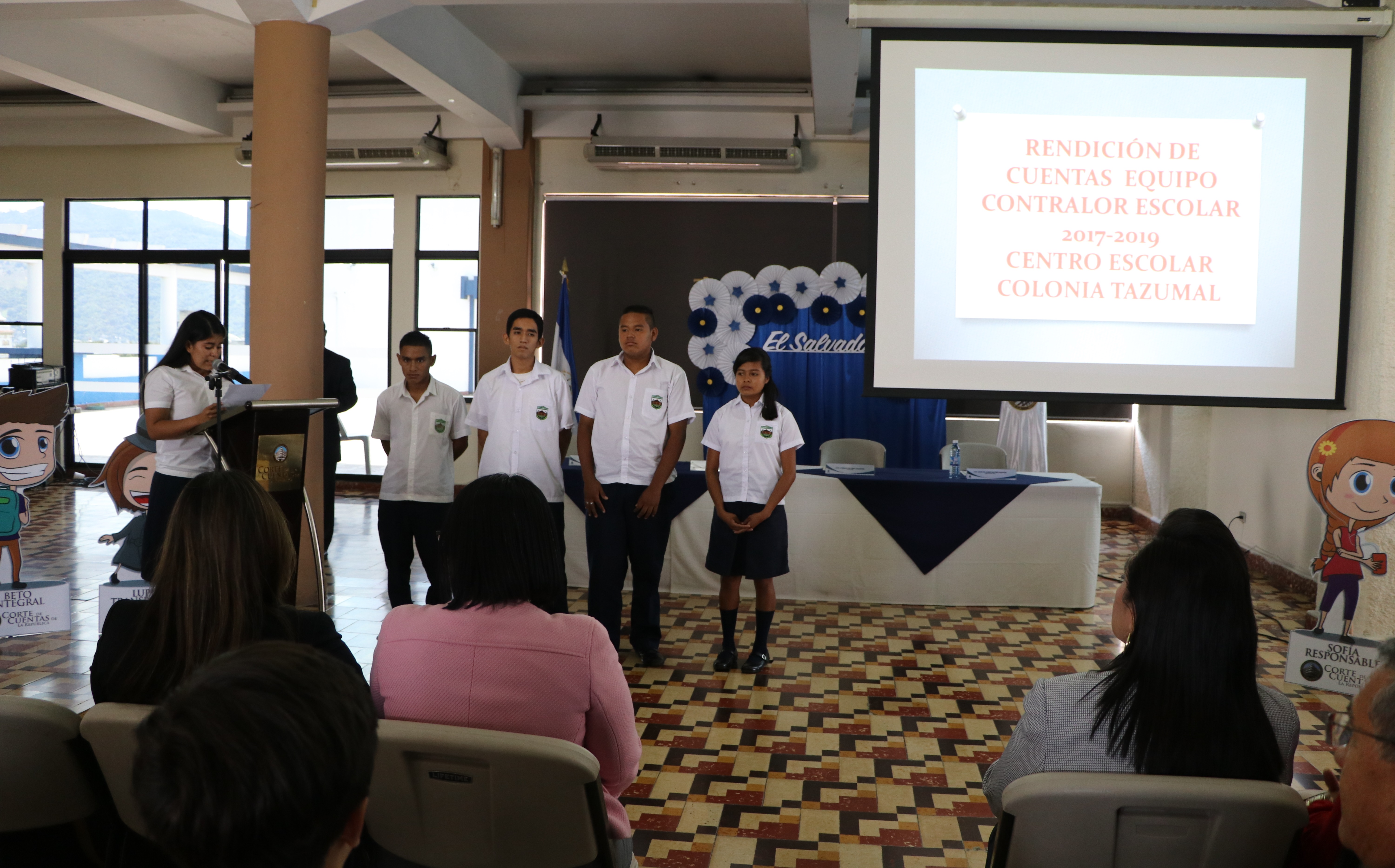 En la sede central de la Corte rindieron cuenta los estudiantes de los centros escolares “Francisco Ignacio Cordero”, “Dr. Ranulfo Castro”, Santa Cruz, Colonia Tazumal, “Simón Bolívar”, Colonia Mielera, “Guadalupe Renata”, Cantón Los Cocos y Centro Escolar La Magdalena, dando a conocer que en el marco del Programa efectuaron campañas de sensibilización sobre la necesidad de cuidar el patrimonio escolar, cultivo de huertos caseros, campañas de limpieza, de reciclaje y de cuido del agua en la escuela; jornadas de verificación de la entrega de alimentos, zapatos y uniformes, entre otros.