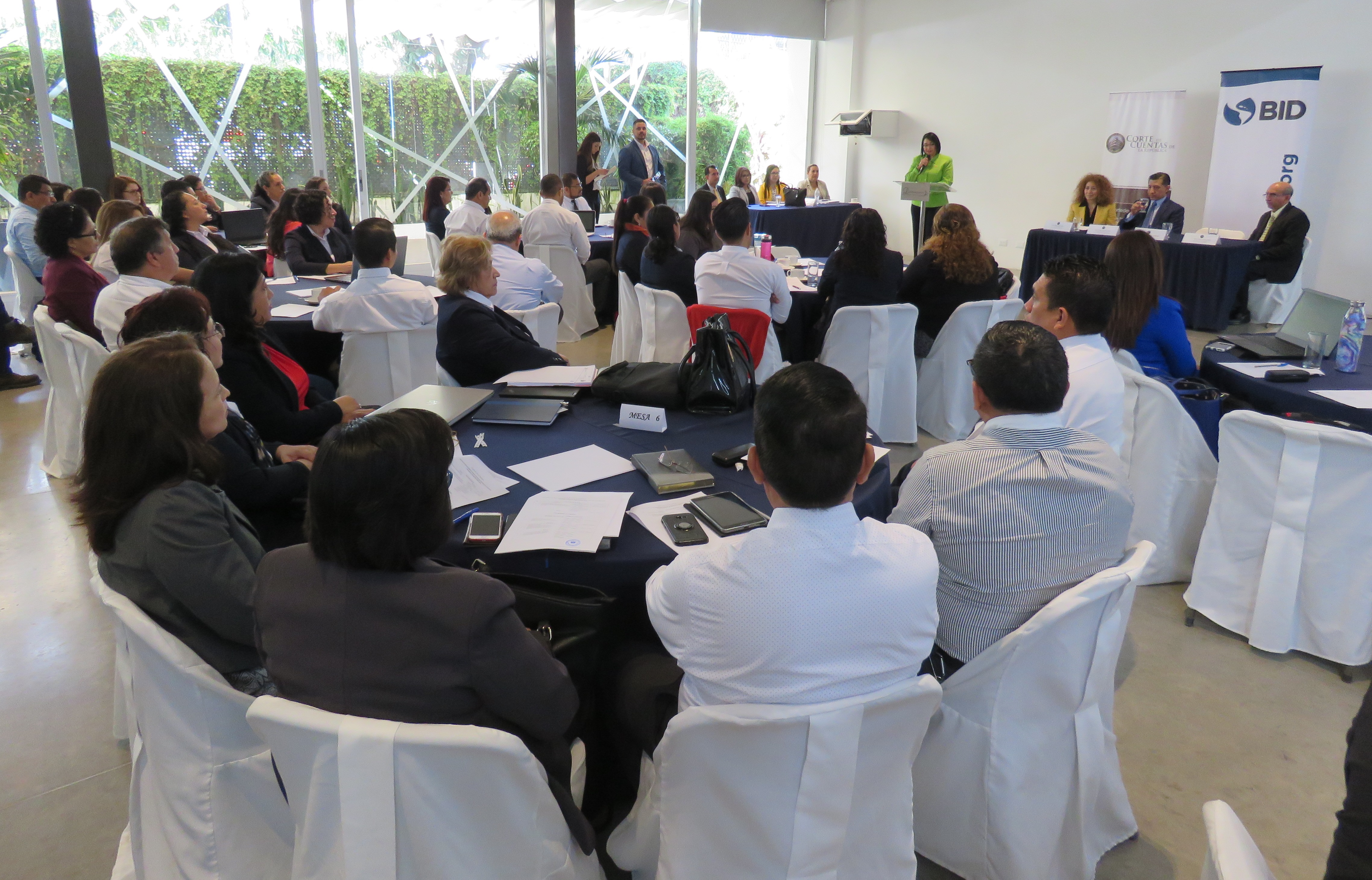 La Presidente de la Corte de Cuentas de la República Licda. Carmen Elena Rivas Landaverde, y representantes del Banco Interamericano de Desarrollo (BID) inauguraron el seminario “Aplicación de la Guía de Auditoría Financiera de Proyectos Financiados por la Cooperación Internacional”, dirigido a 67 participantes.