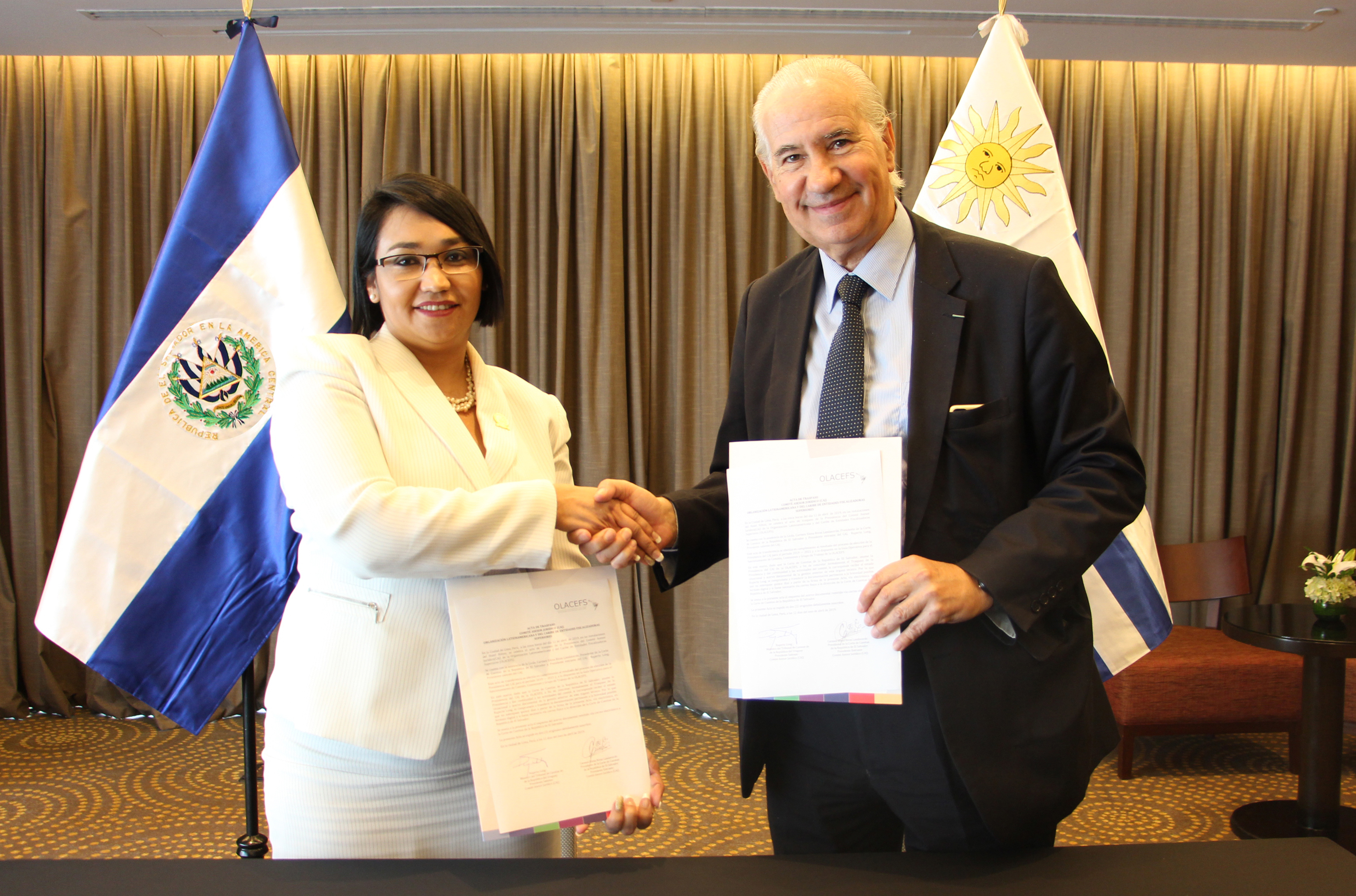 En la Ciudad de Lima, República del Perú, la Presidente de la Corte de Cuentas Carmen Elena Rivas Landaverde, recibió oficialmente la Presidencia del Comité Asesor Jurídico (CAJ) de la Organización Latinoamericana y del Caribe de Entidades Fiscalizadoras Superiores (OLACEFS), de manos del Ministro del Tribunal de Cuentas de la República del Uruguay y Presidente saliente de dicho Comité, Ruperto Long. En acto protocolar realizado el pasado 12 de abril.