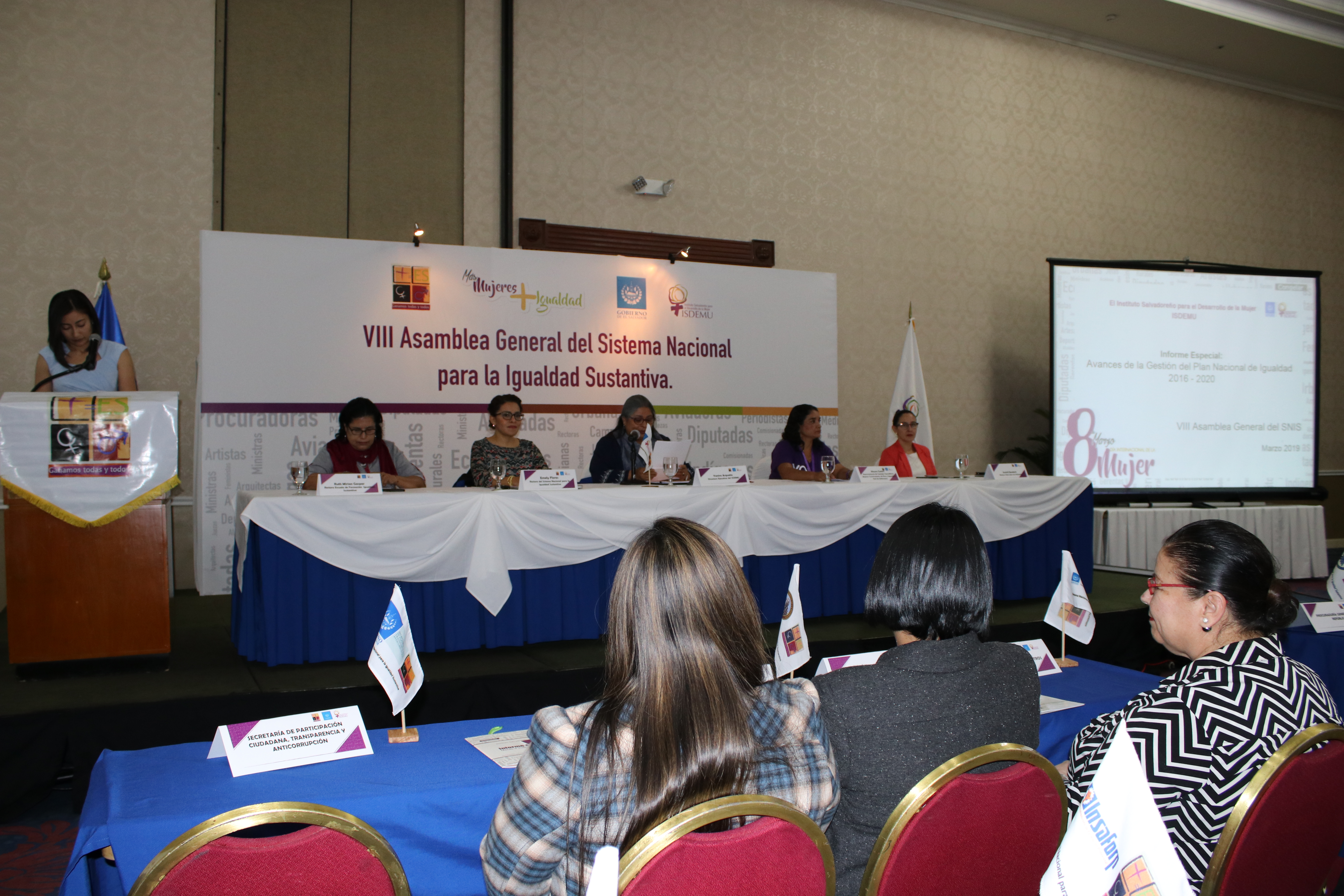La Presidente Licda. Carmen Elena Rivas Landaverde y la Primera Magistrada Licda. María del Carmen Martínez Barahona de la Corte de Cuentas de la República, participaron en la VIII Asamblea General del Sistema Nacional para la Igualdad Sustantiva organizada por el Instituto Salvadoreño para el Desarrollo de la Mujer (ISDEMU), con el objetivo de conocer los avances del Plan Nacional para la Igualdad 2016-2020.