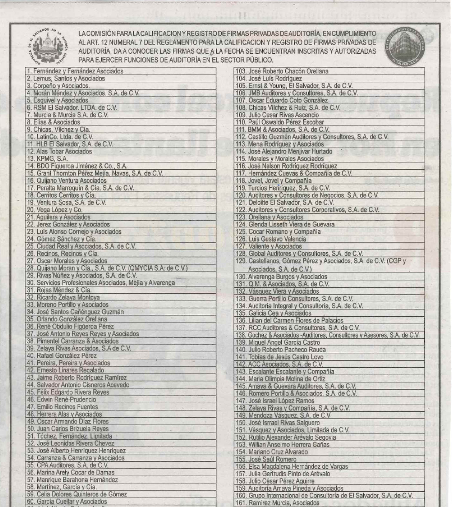 La Comisión de la Corte de Cuentas de la República para la Calificación y Registro de Firmas Privadas de Auditoría, en cumplimiento al artículo 12, numeral 7 del Reglamento para la Calificación y Registro de Firmas Privas de Auditoría, dio a conocer recientemente, en periódico impreso de mayor circulación nacional, listado de las 200 firmas que a la fecha se encuentran inscritas y autorizadas para ejercer funciones de auditoría en el sector público.