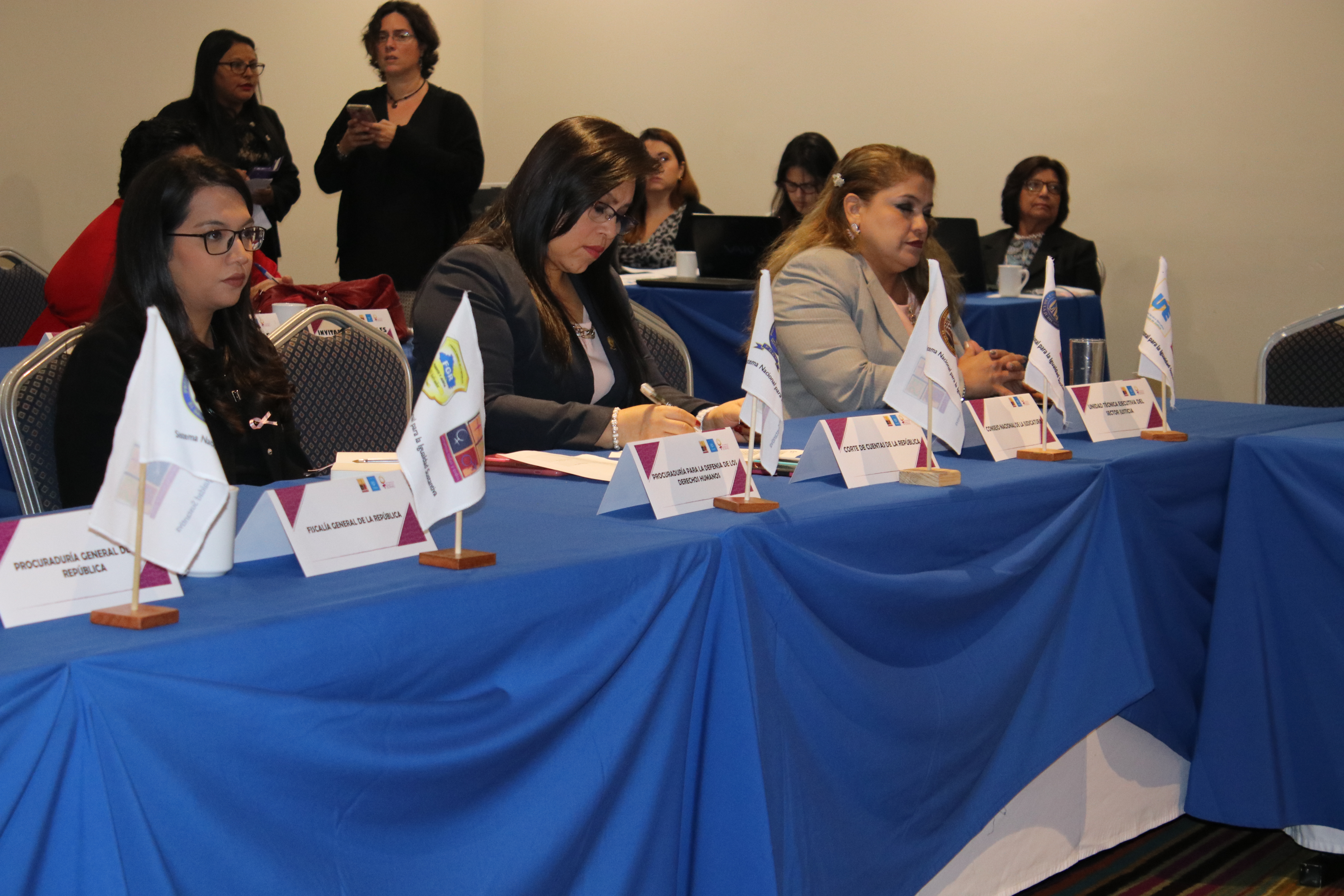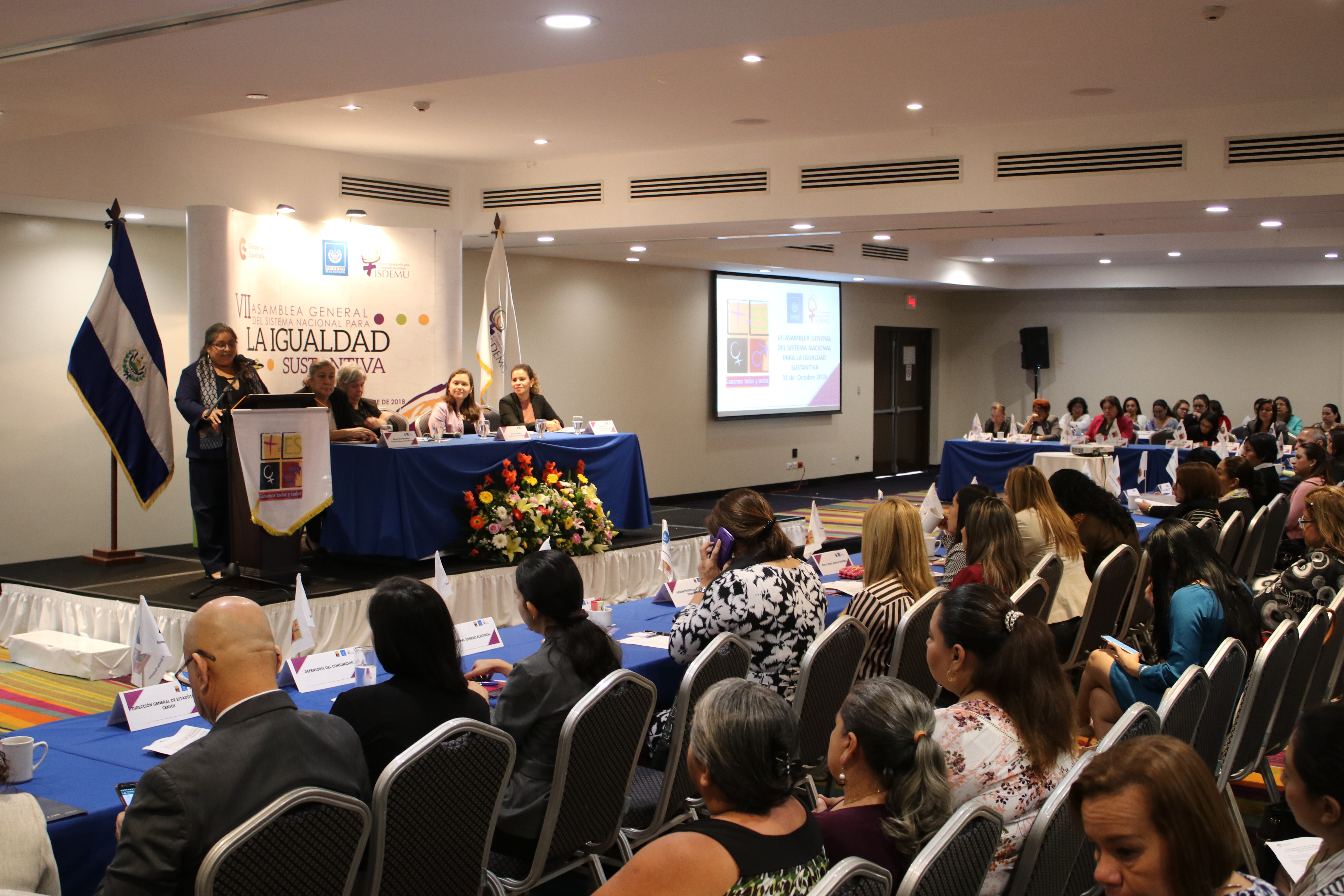 La Primera Magistrada de la Corte de Cuentas de la República, Licda. María del Carmen Martínez Barahona, y las licenciadas Patricia Dagmar Menjivar de Palacios, Coordinadora General Administrativa y Patricia Ivonne Domínguez de Barahona, Encargada de la Unidad de Género institucional, asistieron a la VII Asamblea General del Sistema Nacional para la Igualdad Sustantiva, organizada por el Instituto Salvadoreño para el Desarrollo de la Mujer (ISDEMU), en un hotel capitalino.