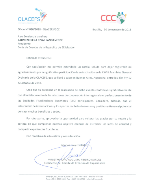 Por su parte, el Ministro del Tribunal de Cuentas de Brasil y Presidente del Comité de Creación de Capacidades de la OLACEFS, Joao Augusto Ribeiro Nardes, externó también su agradecimiento a su colega salvadoreña por la participación de la institución en el evento internacional. “Su presencia contribuyó significativamente con el fortalecimiento de las relaciones de cooperación interregional y el perfeccionamiento de las Entidades Fiscalizadoras Superiores participantes. Considero además, que el intercambio de informaciones y los aportes recibidos fueron muy positivos y tienen el potencial de traer muchos beneficios a todos”, subrayó su par brasileño en su nota.